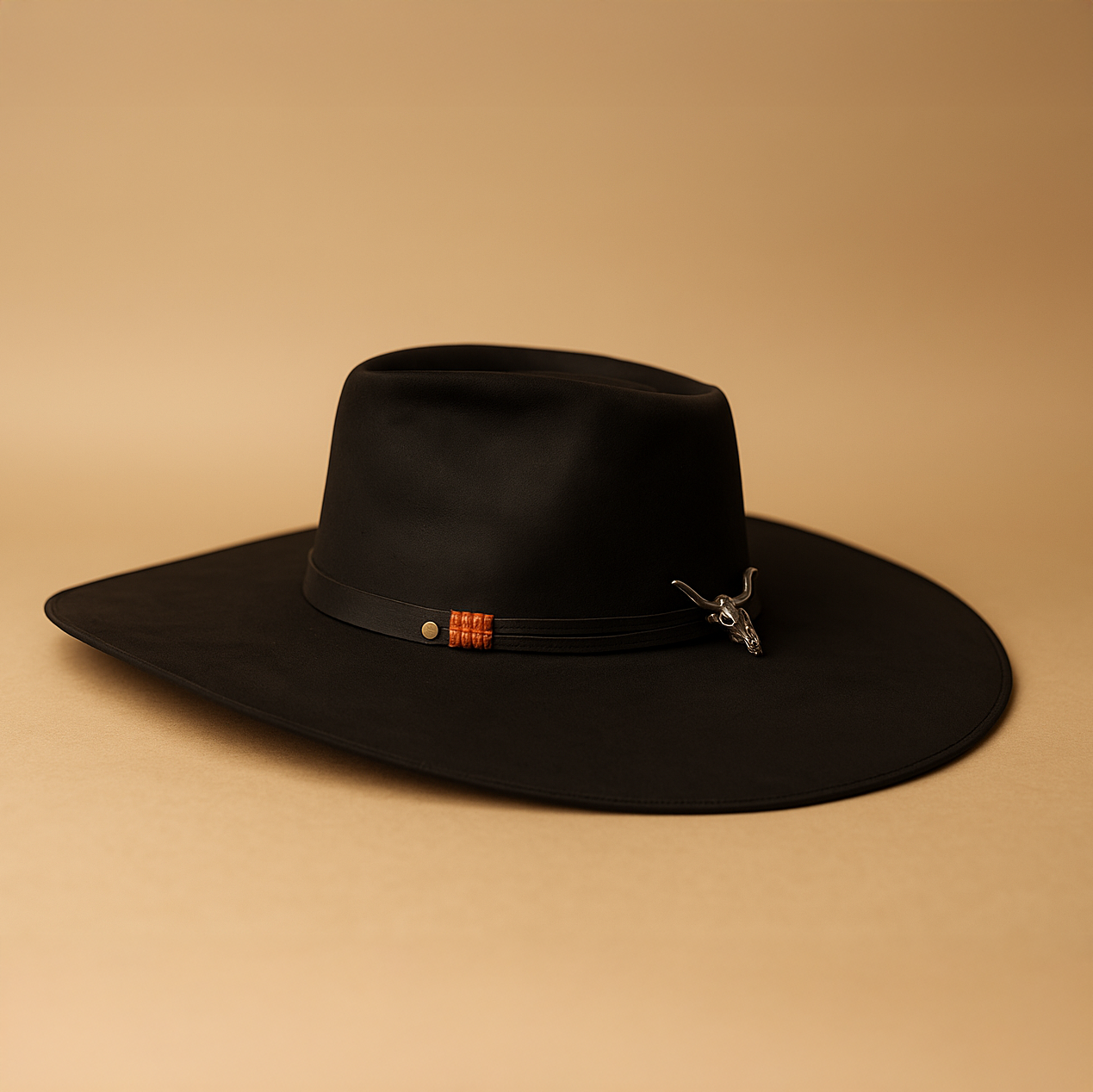 Espíritu del Oeste nace de la inspiración vaquera y el carácter libre del horizonte abierto. Confeccionado en cuero café oscuro, proyecta fuerza, presencia y autenticidad. Su cinta, realzada con un emblema plateado de toro, representa el poder, la resistencia y el espíritu indomable de quienes eligen su propio rumbo. Un sombrero con identidad fuerte, pensado para vivir sin ataduras.