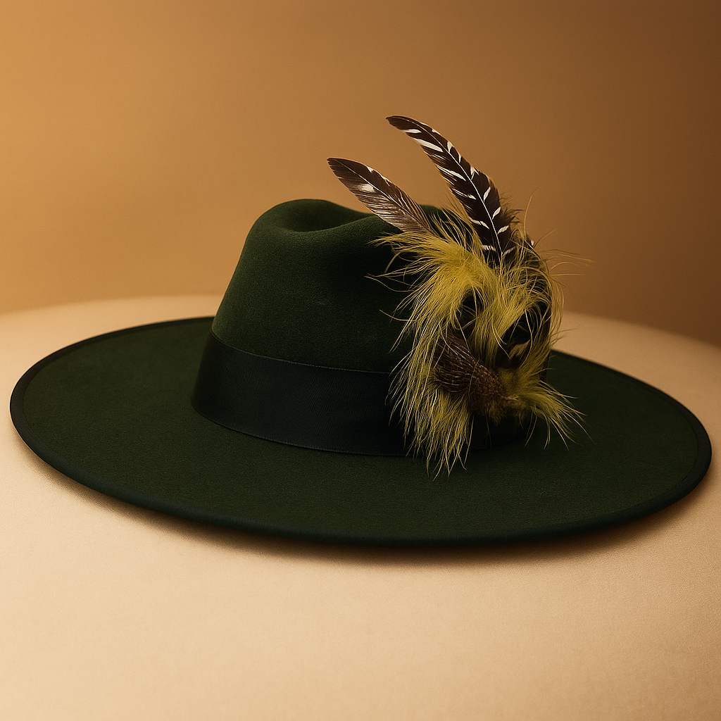 Un sombrero verde profundo con una cinta decorada con plumas verdes a juego. Un guiño a la naturaleza, para quienes caminan con el alma del bosque y el porte de un rey.