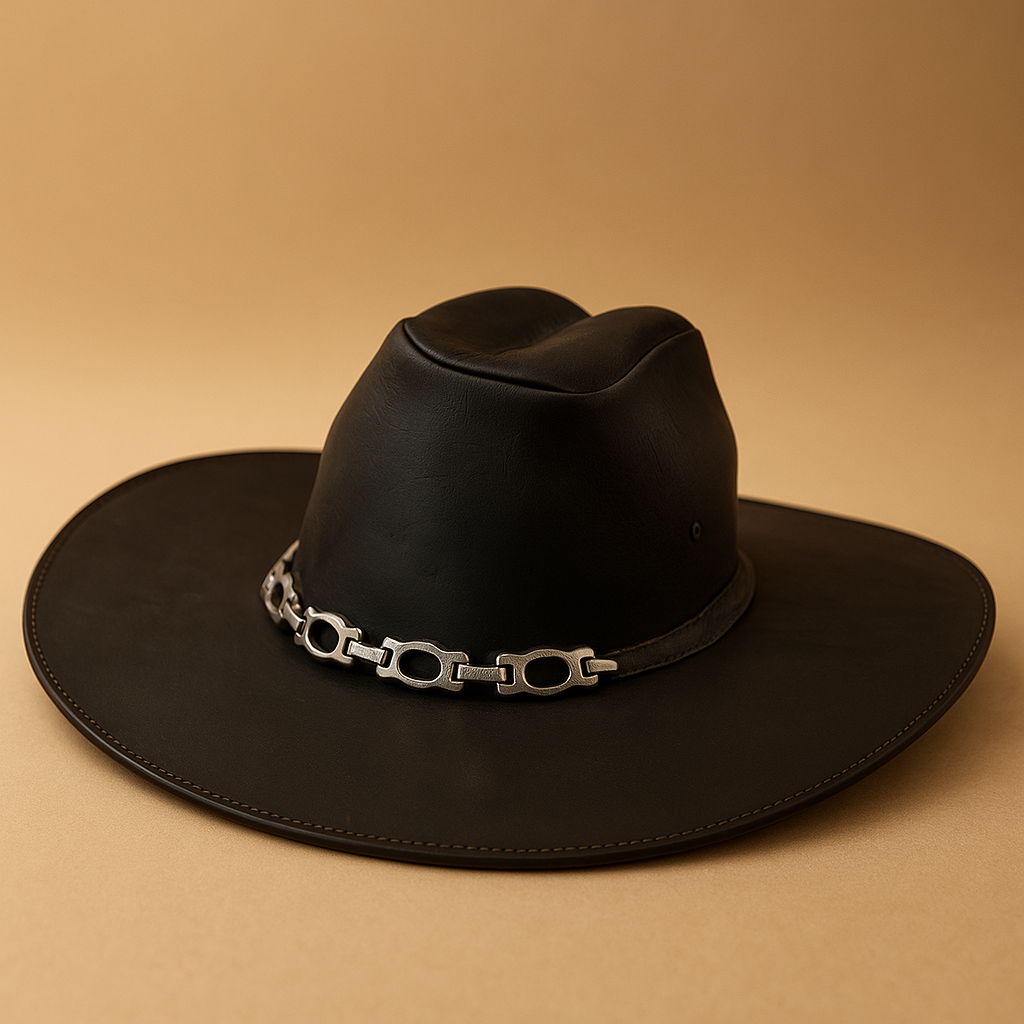 Un fedora de cuero café con una cinta adornada por un patrón metálico firme, como forjado a mano. Su diseño impone respeto, fuerza y una presencia indiscutible.